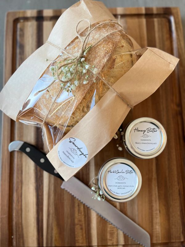 Fresh churned butter. You choice of: Honey, herb and garlic, cinnamon sugar.